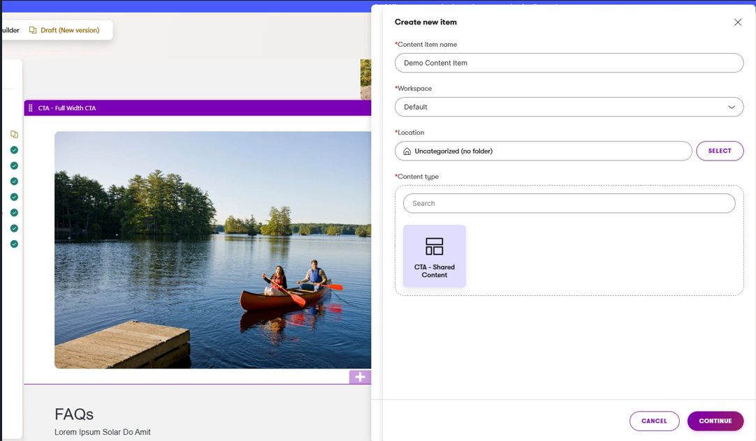 DXPs have long supported both structured content and page builder functionality for this reason. Unfortunately, it has traditionally been a confusing and disjointed experience. For example, the DXP implementation may have content types for Hero Banners, Calls-to-action, Products, FAQs, Employee Bios, and Testimonials. The end user could then create a page using templates and widgets and pull the desired content items onto the page allowing reuse across the site. The downside to this has been that there are common situations where a marketer is creating a new page in the CMS and goes to reference a piece of content that doesn’t yet exist. Now they must leave the page, go create the content type, and then go back to the page and add the content type to the page. If this happens a few times, a simple page creation task that should have taken a few minutes may have taken an hour.