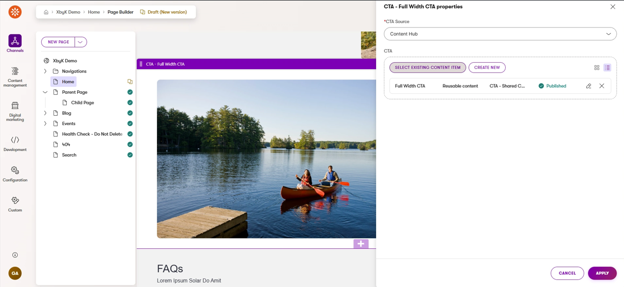 As you can see from the example above, Kentico has made it very easy to work with the X by K Content Hub content from the channels as well. In the example below, a content editor using the Page Builder can put a new CTA widget on the page and then easily browse the content hub for the CTA content Item they want to use to populate that CTA. That one content item can be used across many pages on the website and even other channels like email.